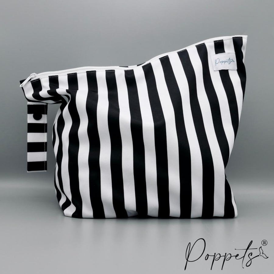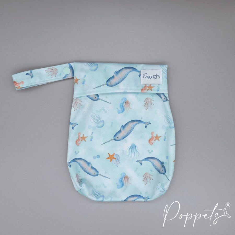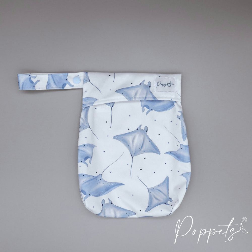 Our medium bags have a wide bottom which is great for stacking nappies in, leaving space on top for a change of clothing, a second wet bag for dirties and one of our mini pouches for wipes.